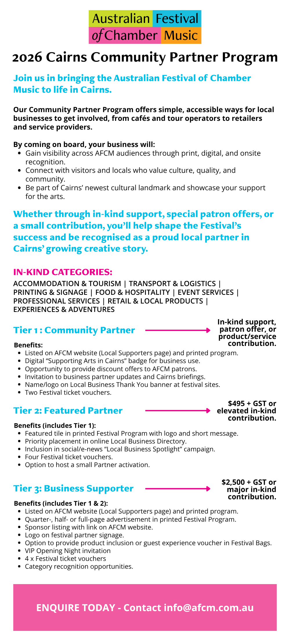 AFCM’s Community Partner Program offers Cairns businesses a simple, affordable way to be part of the Festival’s first year in the region. The program is designed to build local ownership and connection by inviting cafés, retailers, tourism operators, service providers and small businesses to support the Festival through in-kind contributions, small sponsorships or patron offers. Partners receive clear, visible recognition across AFCM channels and become part of a network that helps shape the Festival’s presence in Cairns. |