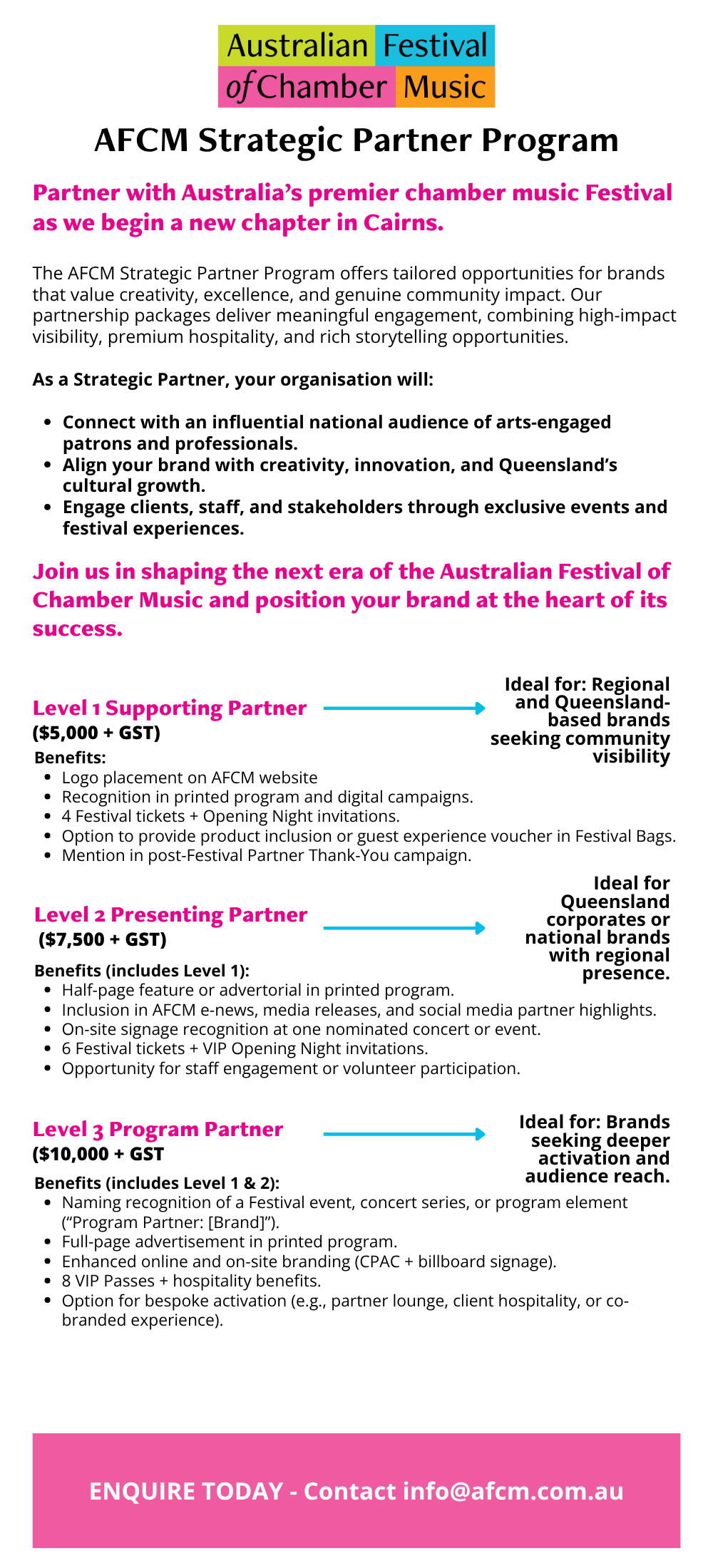 The Strategic Partner Program is designed for organisations looking for deeper engagement and brand alignment with AFCM as it establishes its new home in Cairns. These partnerships offer meaningful opportunities for visibility, hospitality, client engagement and association with a nationally recognised arts event. Tailored to suit regional, state and national brands, the program provides a structured way for partners to support cultural growth in Far North Queensland while connecting with AFCM’s audiences, artists and community. |